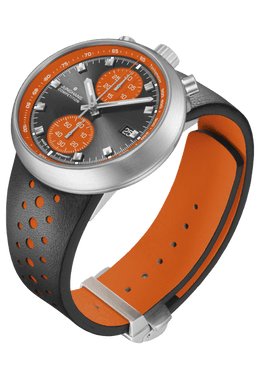 Sports performance encapsulated in a watch: The colour and style are a clear nod to the historic archetype from the 1970s. An anthracite- coloured dial is in stark contrast to the orange of totalisers and tachymeter. The slightly elliptical form lends an extraordinary dynamic to the watch. This model is limited to 1972 units.