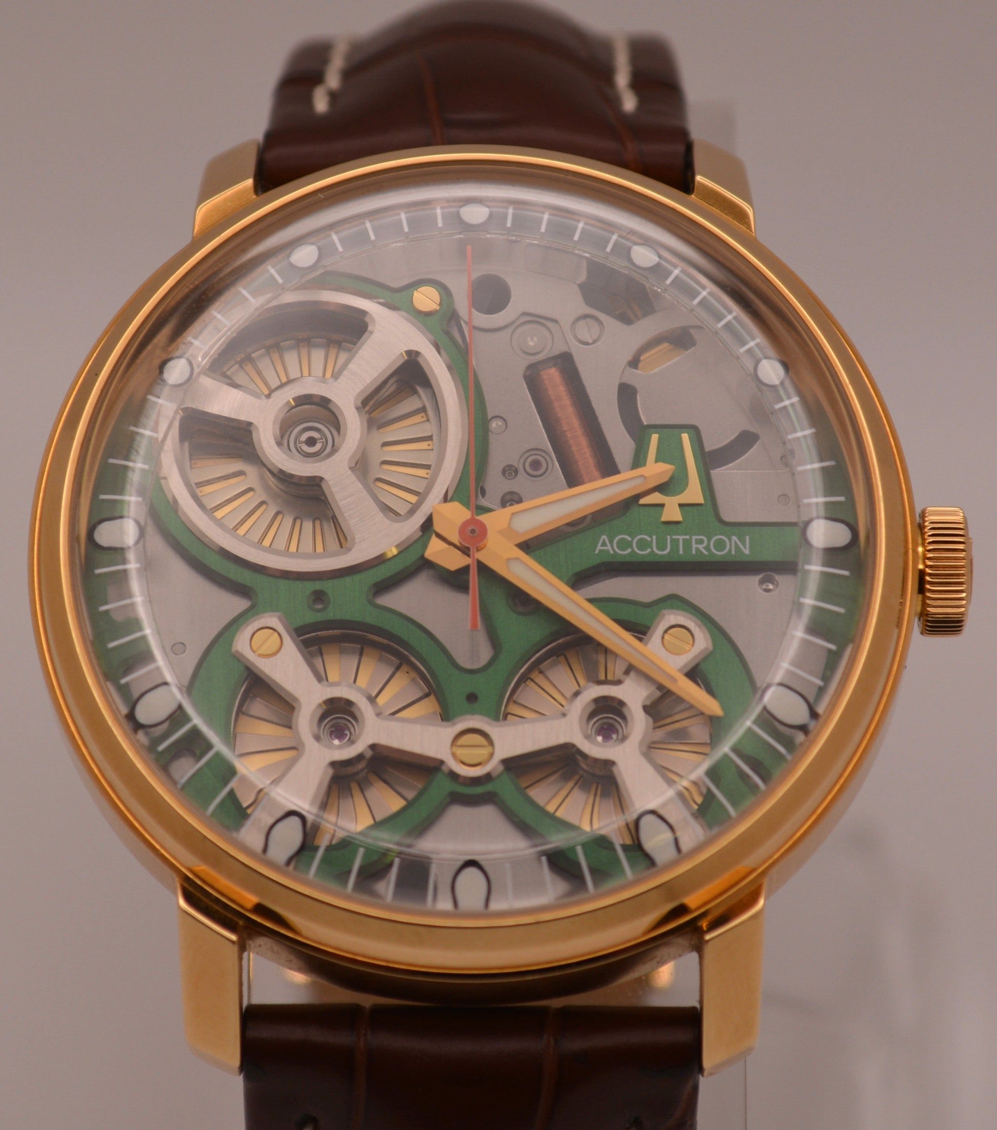 Highly collectible and limited to just 60 individually numbered pieces to commemorate the 60th anniversary of the Accutron brand, this limited edition Spaceview 2020 18k gold men's timepiece has elevated style to go along with its cutting-edge technology. The proprietary electrostatic movement uses an intricately engineered motor and turbine system to generate both power and the smooth forward glide of the second hand. With this luxury watch on your arm, you won’t need to say a word to make a statement. This watch is in 90% condition. Box and papers included.