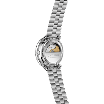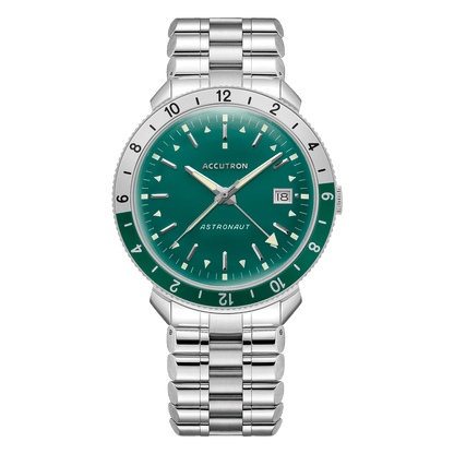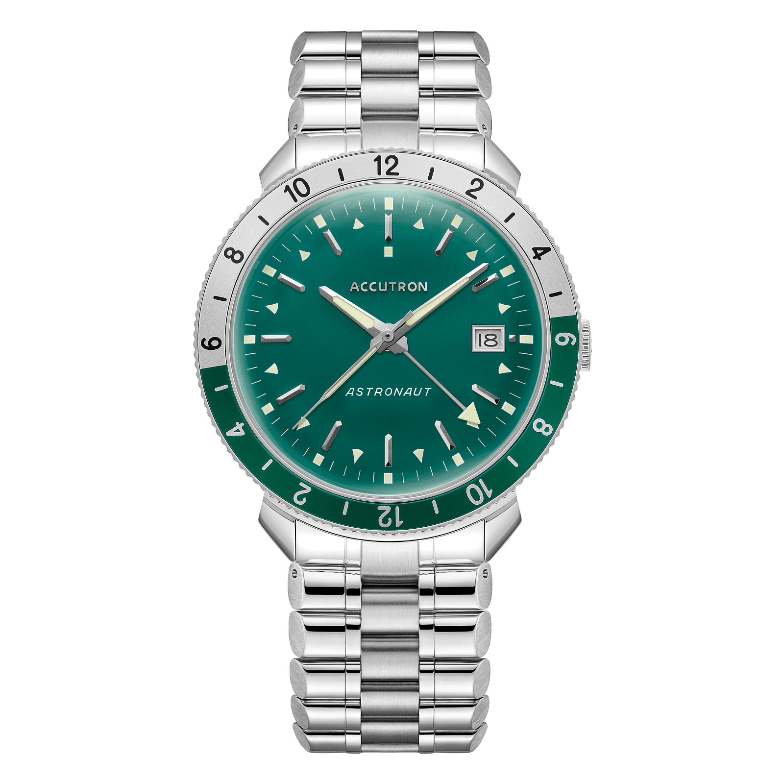 Accutron is proud to introduce a new addition to their storied Astronaut collection, honoring the original 1968 model. Staying true to the distinctive design of the original version, this new Astronaut features a striking green dial and distinctive matching green day/night bezel. Featuring silver-tone hour hands, hour markers and silver-tone stainless steel easy-release bracelet, this Astronaut is outfitted with the Accutron Caliber 9058 GMT automatic movement with a 50-hour power reserve at 28,800 BPH and anti-magnetic resistance up to 16,000 a/m.