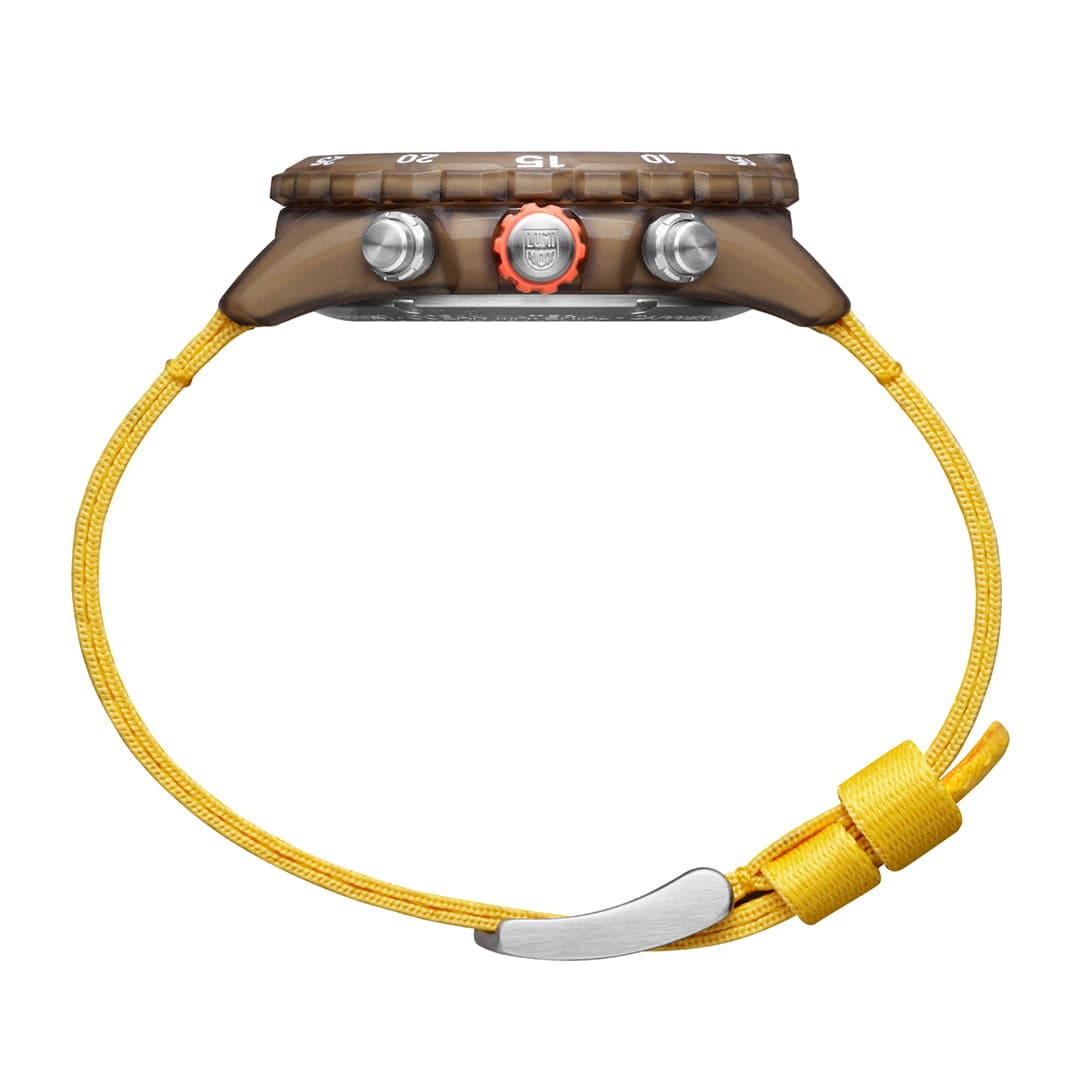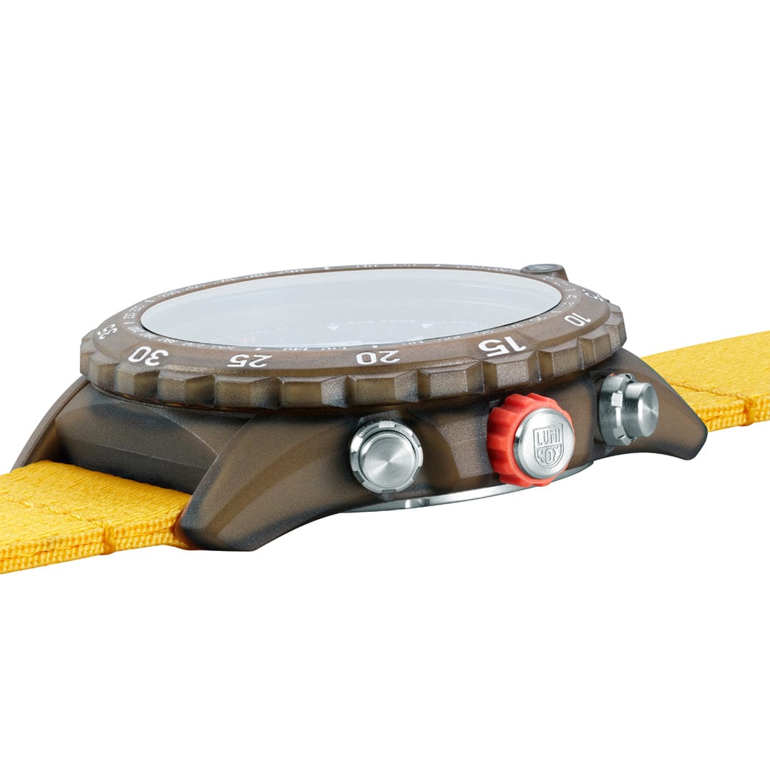 Bear Grylls challenged Luminox to push even further in its quest for sustainability, by utilizing new upcycled plastic material for the case, bezel, and strap in partnership with tide Ocean Material The ecofriendly material provides equal durability and water resistance, both adventure essentials, as CARBONOX The Bear Grylls Survival ECO Master Series intricate dial features a chronograph fuctionality for timing events, underwater or on land with an additional date display at the 6 oclock The standout yellow dial features black details for easy reading and the Bear Grylls logo A matching yellow tide Ocean Material strap provides a comfortable and flexible fit As with any Bear Grylls watch, this watch features his signature orange crown Learn more about tide Ocean Material