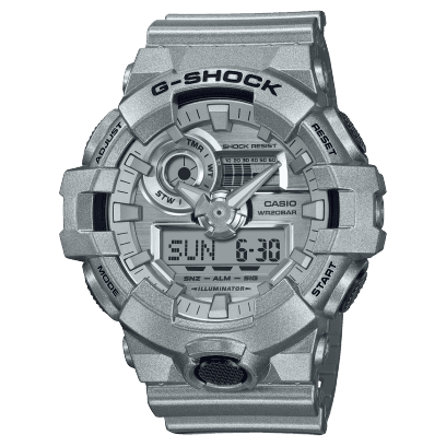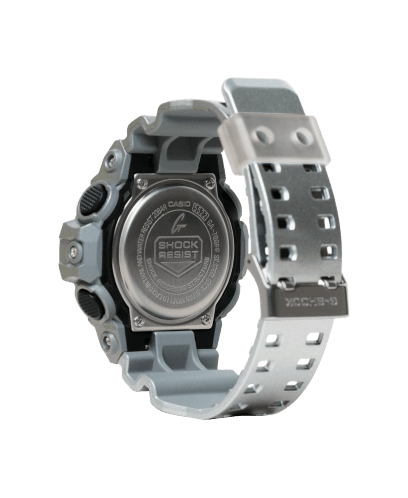 Introducing the G-SHOCK GA700FF-8A - a blend of industrial chic and futuristic design from our iconic Forgotten Future collection. A timepiece that doesn't just tell time, it tells a story of a future envisioned in the past. Adorned in a metallic silver coating, the GA700FF-8A is a testament to the G-SHOCK commitment to innovation. Its robust design is enhanced with a silver vapor deposition on the dial, creating a striking visual contrast with the metallic-hued angular indices. This aesthetic is reminiscent of retro science fiction, lending a unique, timeless appeal to the watch. The GA700FF-8A doesn't compromise on functionality either. Staying true to the G-SHOCK ethos, it's designed to withstand the harshest conditions while maintaining its stylish appeal. The metallic paint not only adds to its look, but also contributes to its durability, making it the perfect accessory for the modern, adventurous individual. Join us in a journey to the Forgotten Future. Step into the world of G-SHOCK's GA700FF-8A and experience a watch that transcends time, where the nostalgia of the past meets the innovation of the future.