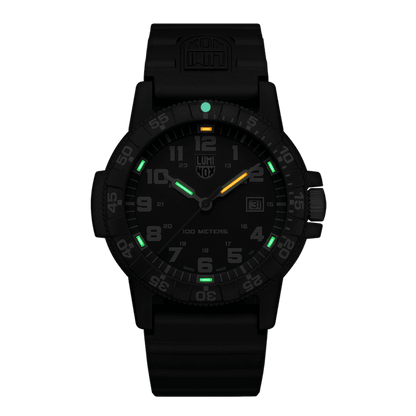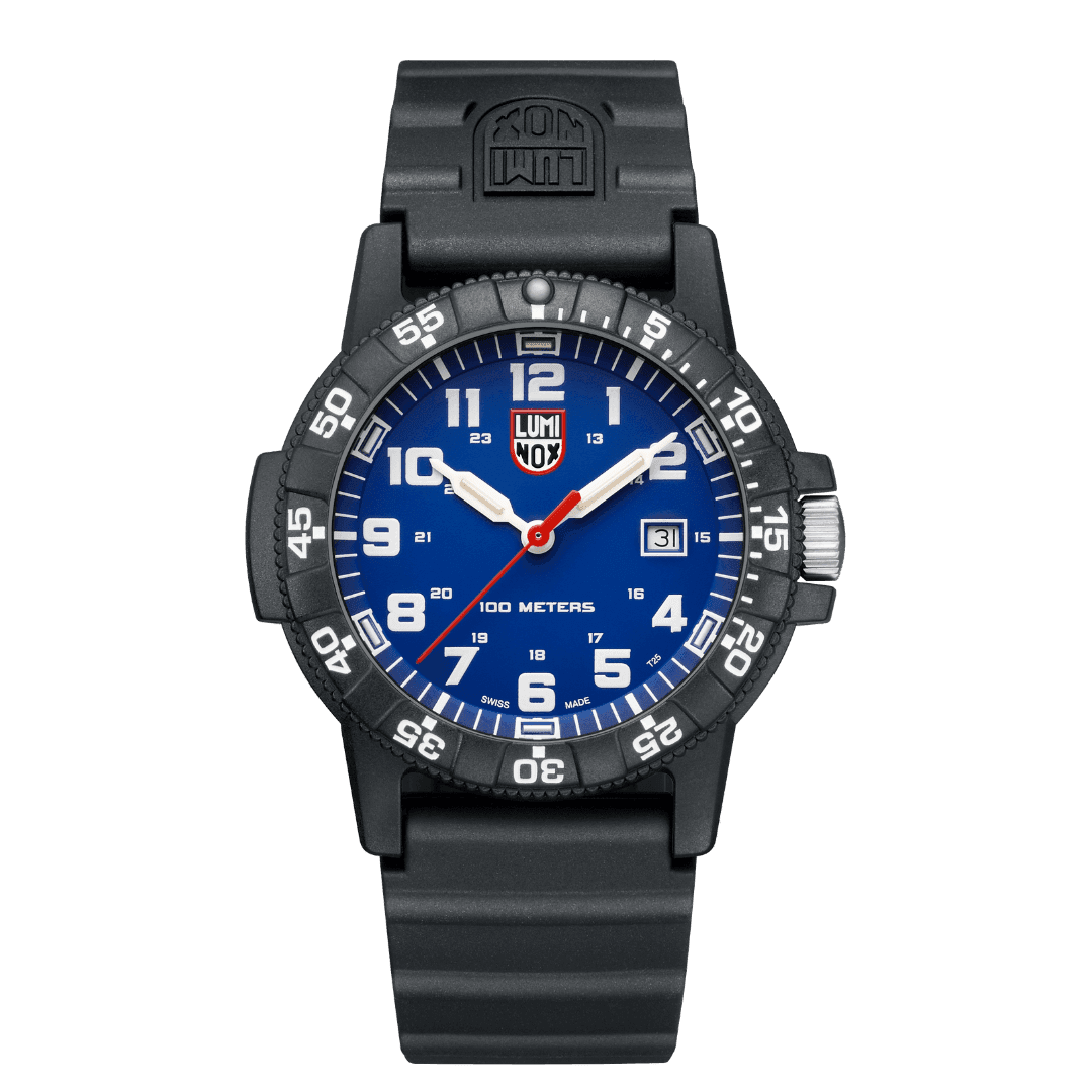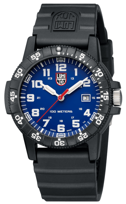The Leatherback Sea Turtle Giant watch gets its name from the design of the watch, the classic Luminox case with the proteced crown balanced by an opposite outcropping, resembles the shape of a turtle The 44mm case is made of durable and lightweight signature CARBONOX and is water resistance up to 100 meters The blue dial with white numerals and hands, and a red second hand, is equipped with the proven Luminox Light Technology lighting system, providing ataglance visibility for up to 25 years