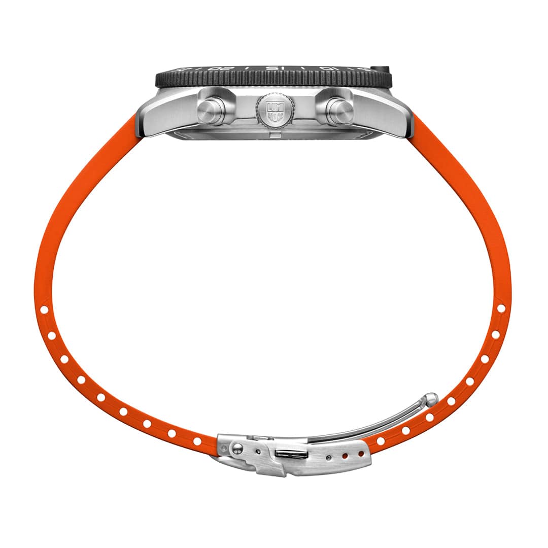 The Pacific Diver Chronograph boasts a 44mm stainless steel case with a CARBONOX unidirectional bezel, a vital instrument for any diver A black dial features white numerals and indicies for easy reading with a striking orange dial ring A matching orange cuttofit rubber strap comes on the watch Mix and match your style by pairing with any other color from our CutToFit strap collection Learn more about our CutToFit Ribber Straps As with every other Luminox timepiece, this Pacific Diver incorporates Luminox Light technology, making sure that your timepiece is visible in any condition for up to 25 years