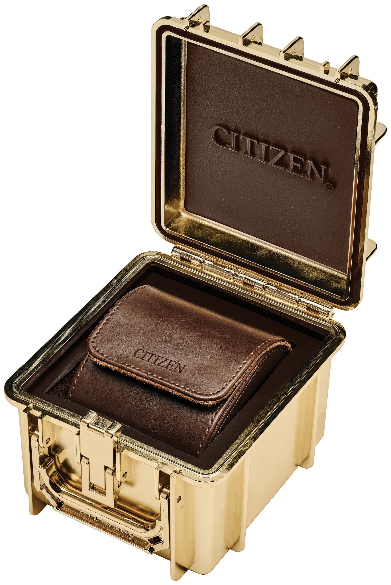 Paying homage to a retro 1973 CITIZEN Bullhead model, the newly modernized CITIZEN Tsuno Chrono Racer showcases a unique case styling, trendy color combinations and is sure to stand out on your wrist. A hand assembled movement, the Tsuno Chrono Racer features 1/5-second chrono, alarm, tachymeter, instantaneous fly back, power reserve and date. Seen here in a black ion-plated stainless steel case, black leather strap with red constrast stitching and black and silver dial. Featuring our Eco-Drive technology – powered by light, any light. Never needs a battery. Caliber number E210.