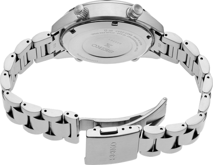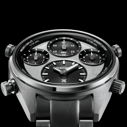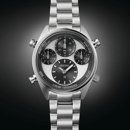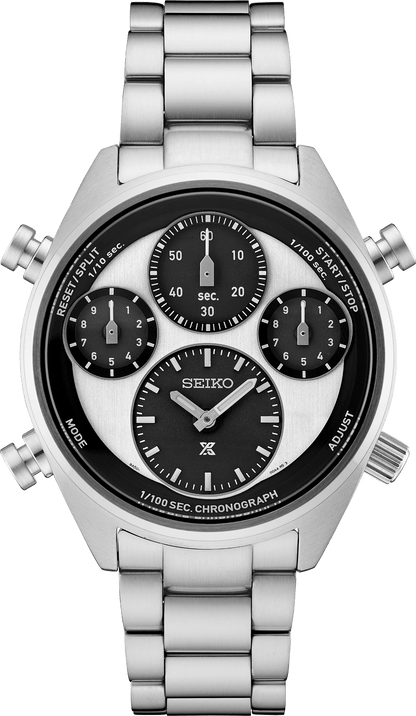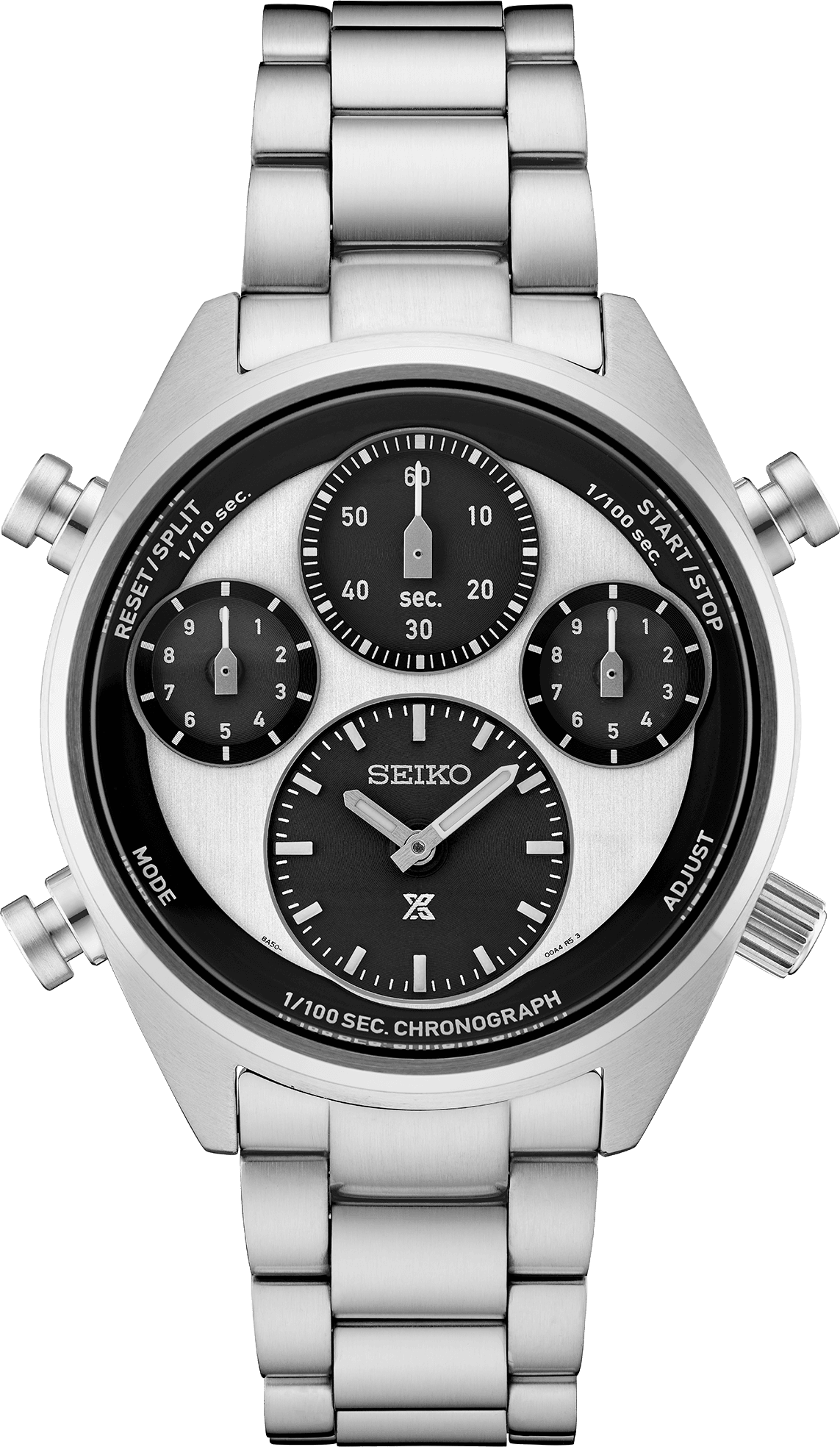 Prospex Speedtimer 1/100 Second Solar Chronograph. Designed for those who treat life as the ultimate adventure, Seiko Prospex keeps moving forward, meeting every challenge with technological excellence and winning design. Featuring the new solar chronograph 8A50 movement, this exceptional watch further advances the high-intensity collection with inspiration from Seiko's – and the world’s – first analog quartz chronograph, which featured a 1/100-second stopwatch. For enhanced legibility, the uniquely designed dial includes a white base with four inset black subdials, separating the time dial from the chronograph indicators, and LumiBrite hands and markers. The chronograph function measures up to 60 minutes of elapsed time in 1/100-second increments and provides a split time function, while the solar cell, powered by any light source, with no battery change required, offers a 6-month power reserve when fully charged. To allow easy utilization of the stopwatch feature, this precision watch features concave tops on the hammer-shaped pushers. With a curved anti-reflective sapphire crystal, this rugged stainless steel timepiece includes a screwdown caseback and tri-fold push button release clasp. 10 bar, 100M Water Resistant