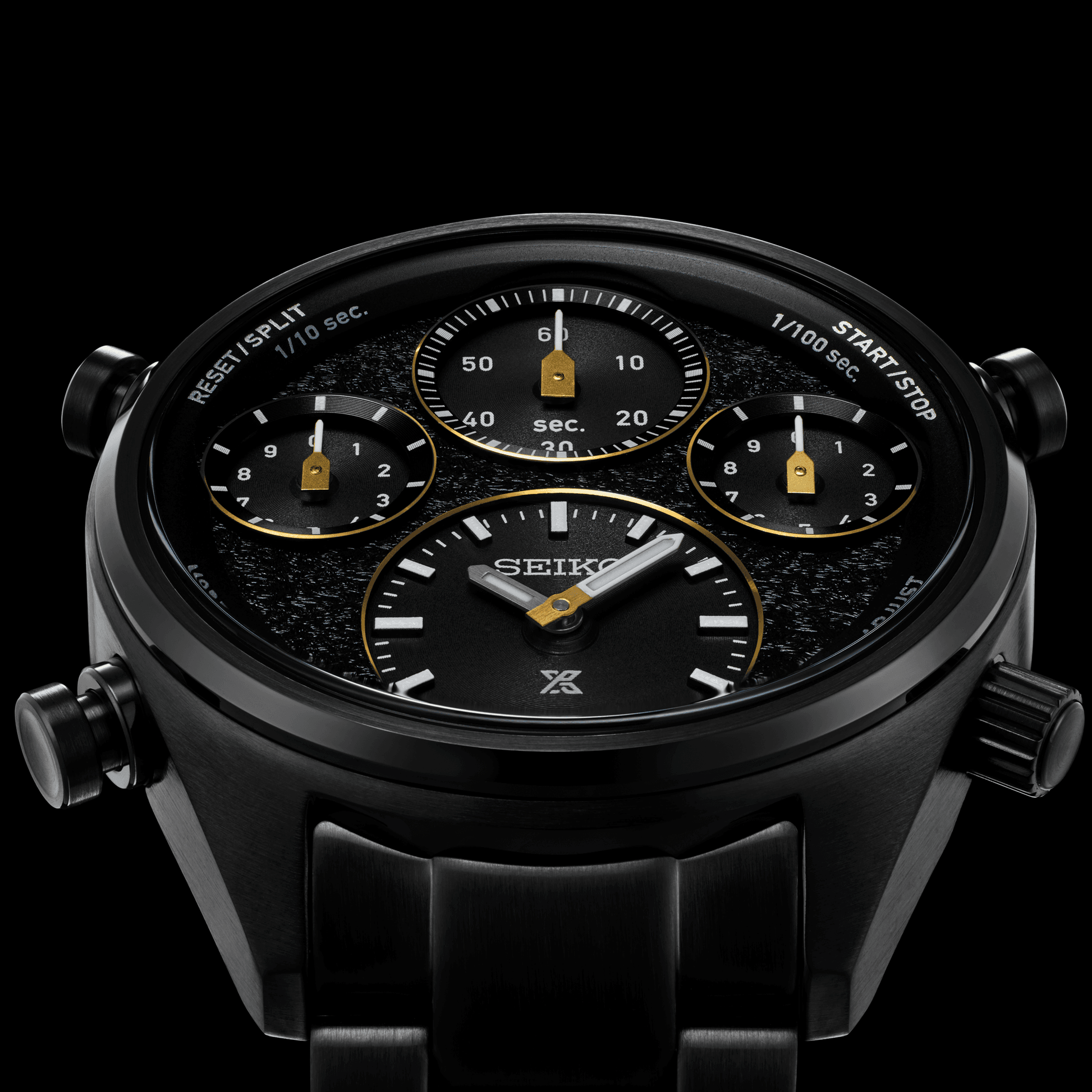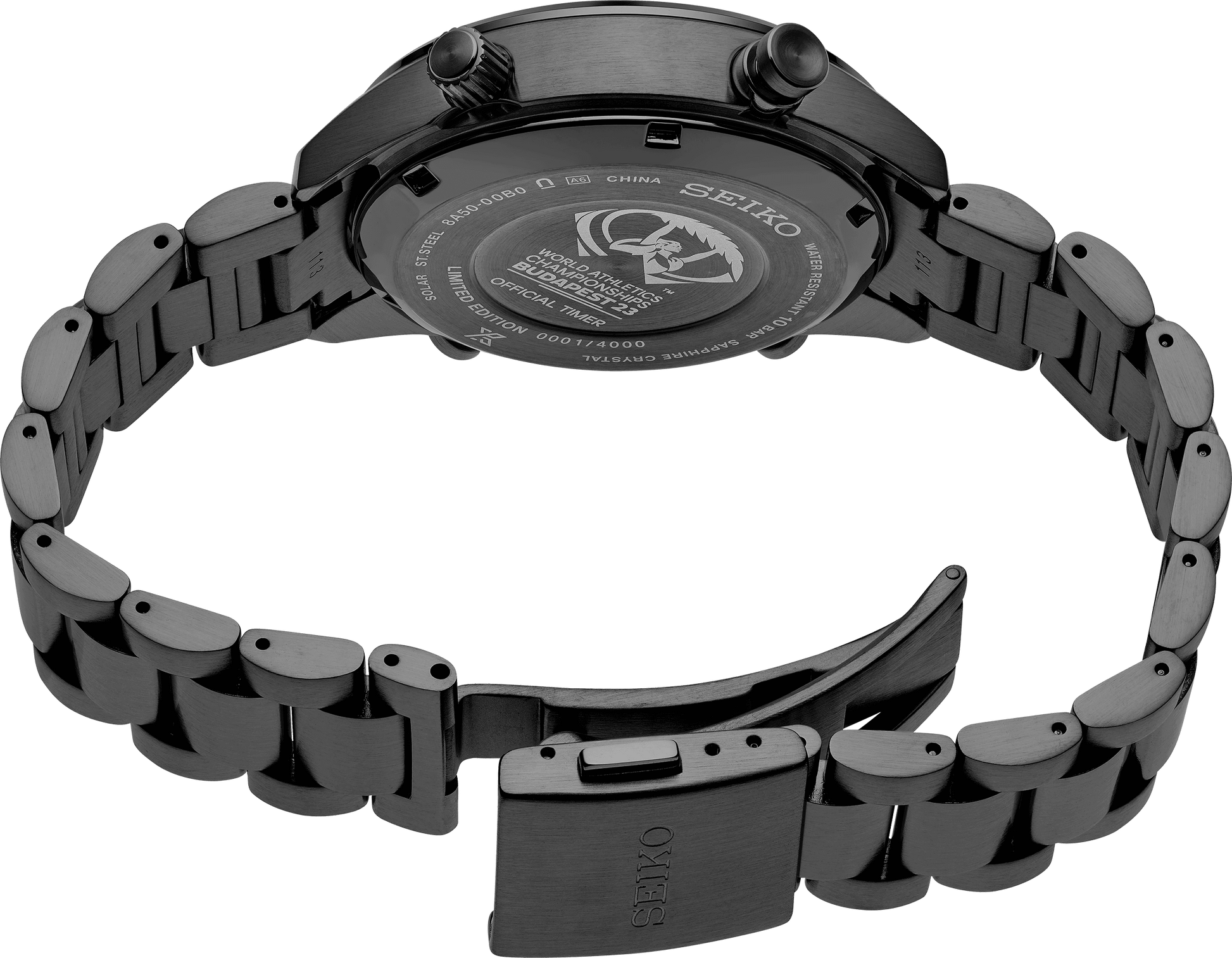 Prospex Speedtimer World Athletics Championship Budapest 2023 Limited Edition. Designed for those who treat life as the ultimate adventure, Seiko Prospex keeps moving forward, meeting every challenge with technological excellence and winning design. As official timer of the World Athletics Championship Budapest 2023, Seiko presents this extraordinary commemorative Limited Edition, available only in a controlled-production run of 4,000, with the production serial number and the official logo for the Budapest Championship engraved on each screwdown caseback. Featuring the new solar chronograph 8A50 movement, this exceptional watch further advances the high-intensity collection with inspiration from Seiko's – and the world’s – first analog quartz chronograph, which featured a 1/100-second stopwatch. To properly reflect world-class athletics, the distinctive black dial is patterned to suggest professional running tracks, while the gold chronograph hands symbolize the highest prize. For enhanced legibility, the uniquely designed dial includes four inset black subdials, separating the time dial from the chronograph indicators, and LumiBrite hands and markers. The chronograph function measures up to 60 minutes of elapsed time in 1/100-second increments and provides a split time function, while the solar cell, powered by any light source, with no battery change required, offers a 6-month power reserve when fully charged. Allowing easy utilization of the stopwatch feature, this precision watch features concave tops on the hammer-shaped pushers. Crafted of stainless steel with black hard coating, this rugged timepiece also includes a curved anti-reflective sapphire crystal and tri-fold push button release clasp. 10 bar, 100M Water Resistant