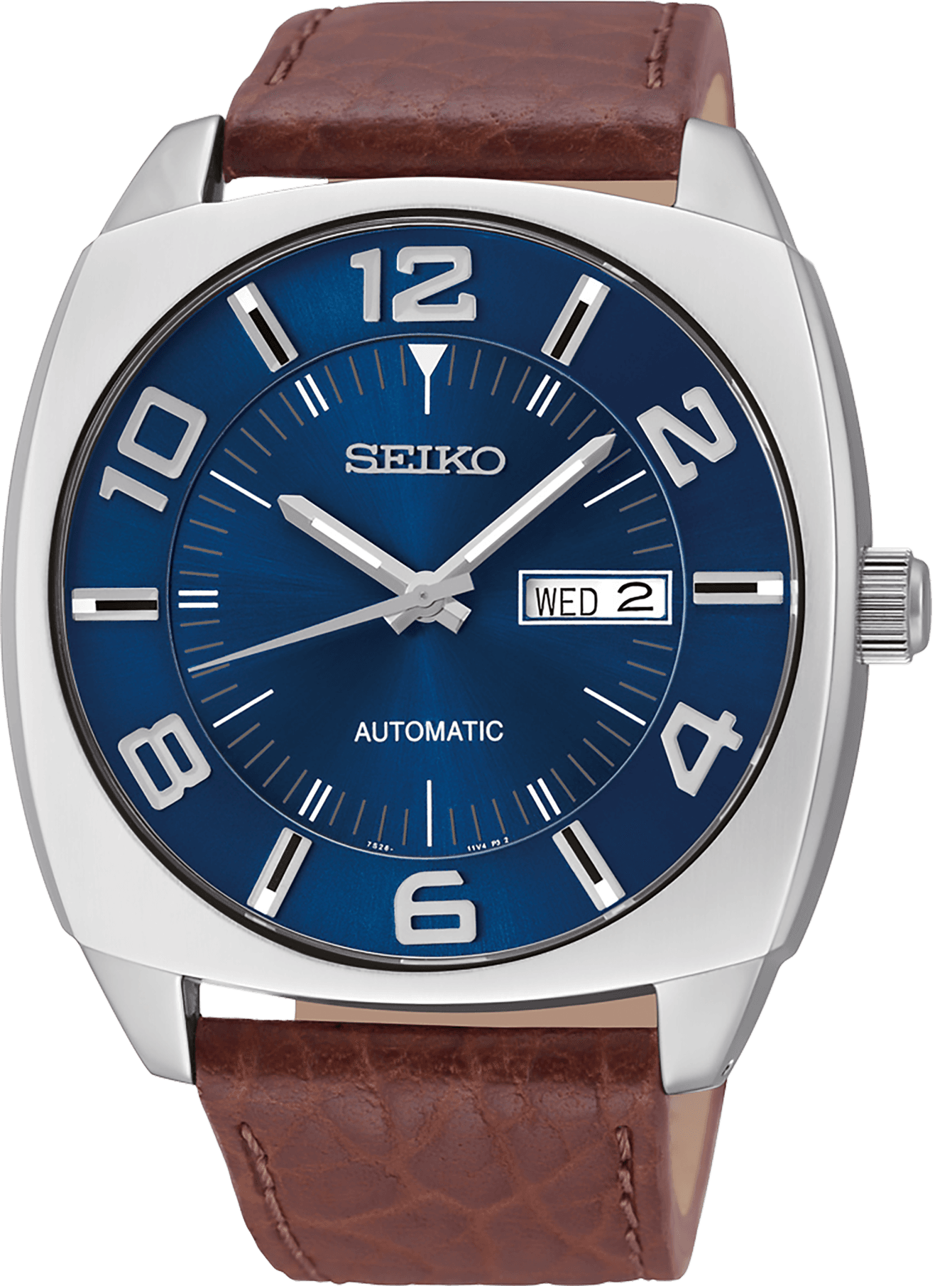 Seiko RECRAFT Series. This casual self-winding automatic timepiece is designed with a square stainless steel case and brown leather band. The blue dial features day/date calendar, luminous hands and markers, and a screwdown see-through case back. 21 jewels. 50 meters water resistant.