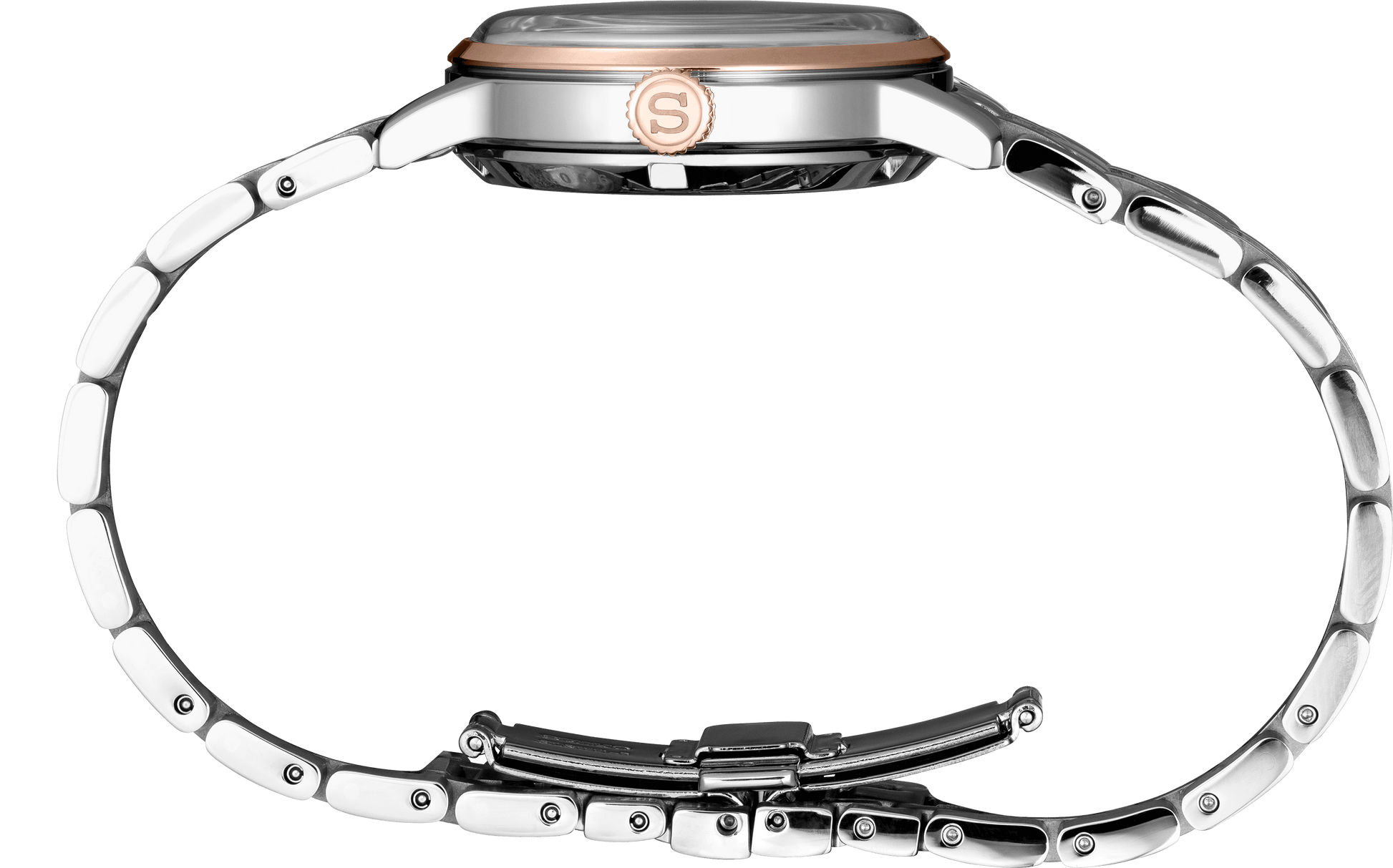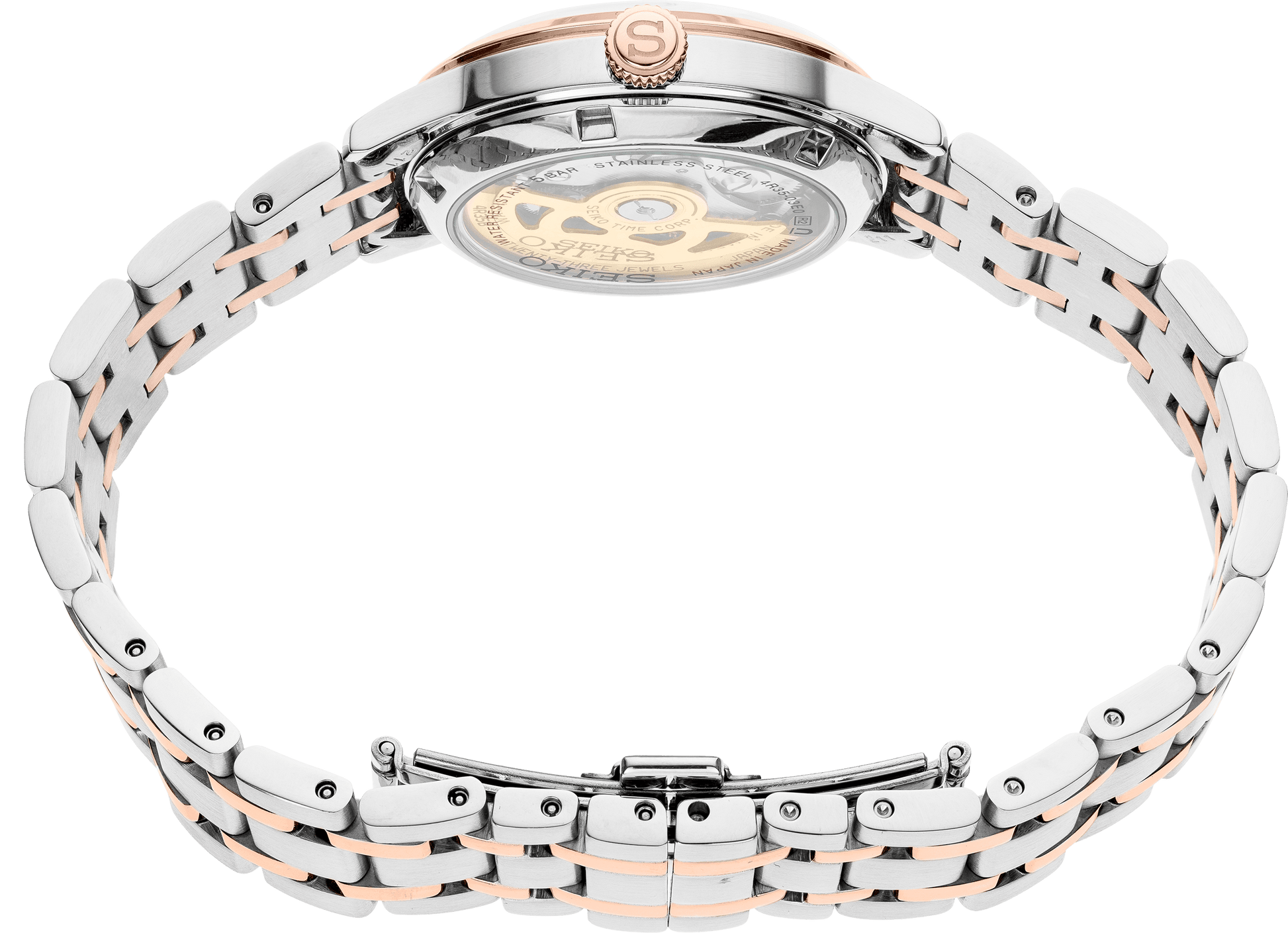 Seiko Presage Cocktail Time. Offering the finest in Japanese mechanical watchmaking, the Presage Collection blends precision technology with superior craftsmanship and design. Offering a feminine twist to the popular Cocktail theme line, this charming watch, inspired by the Pink Champagne cocktail, features a pink dial with a pressed pattern evoking crushed ice and a sugar garnish. The 23-jewel movement, with manual and automatic winding capability, beats at a frequency of 21,600 vibrations per hour, with a power reserve of approximately 41 hours. Crafted of stainless steel with rose-gold two-tone finish, this distinctive timepiece includes a calendar, box-shaped crystal, screwdown see-through caseback, and tri-fold push button release clasp. 5 bar, 50M Water Resistant