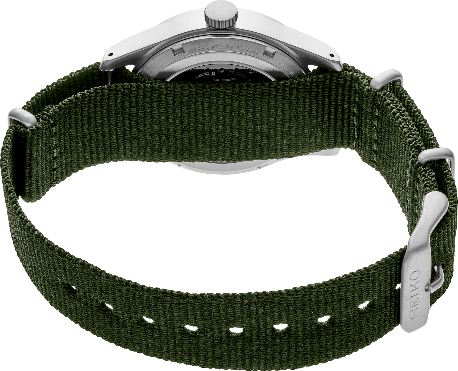 Seiko 5 Sports. Inspired by classic field/military design, this stylishly retro watch offers authentic lines with both durability and all-day excellence. Providing automatic technology that you control with every movement, this versatile watch is powered by a 24-jewel movement that beats at a frequency of 21,600 vibrations per hour, with a power reserve of approximately 41 hours and manual winding capability. The green dial features Arabic numerals, a day/date calendar, red-orange tipped second hand, and luminous hands and markers. Crafted of stainless steel with green nylon strap and a screwdown see-through caseback for a view of classic timekeeping in action. 10 bar, 100M Water Resistant