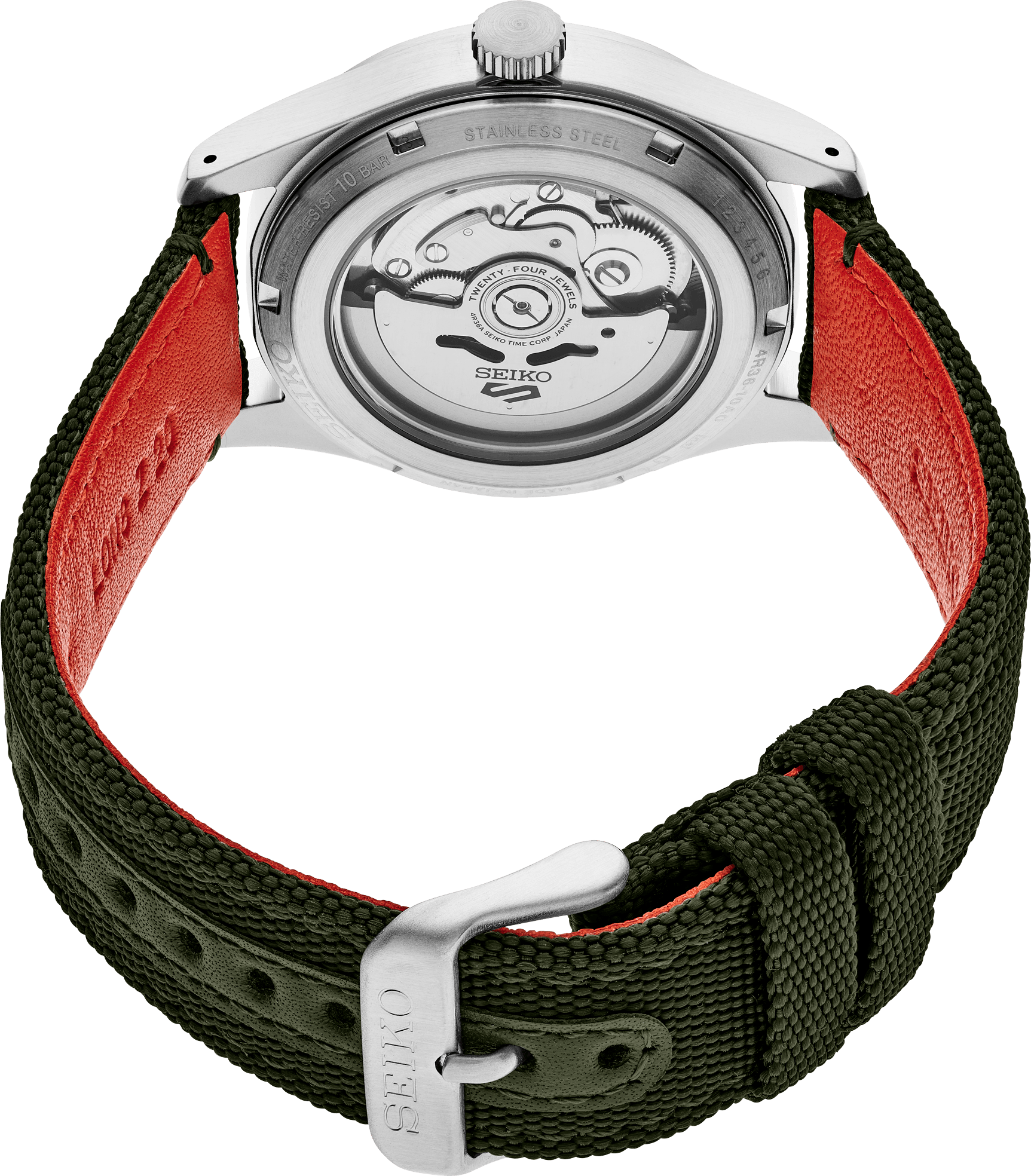 Seiko 5 Sports Collection. Inspired by the vintage designs worn by early pilots, this updated classic offers genuine style with both durability and all-day versatility. Providing automatic technology that you control with every movement, this distinctive watch is powered by a 24-jewel movement that beats at a frequency of 21,600 vibrations per hour, with a power reserve of approximately 41 hours and manual winding capability. With a 60-minute track marked in five-minute increments, the green dial features a day/date calendar, and luminous hands and markers. The orange-tipped second hand provides bright punctuation, intensified by the matching orange liner of the green nylon strap. Crafted of stainless steel with a screwdown see-through caseback for a view of classic timekeeping in action. 10 bar, 100M Water Resistant