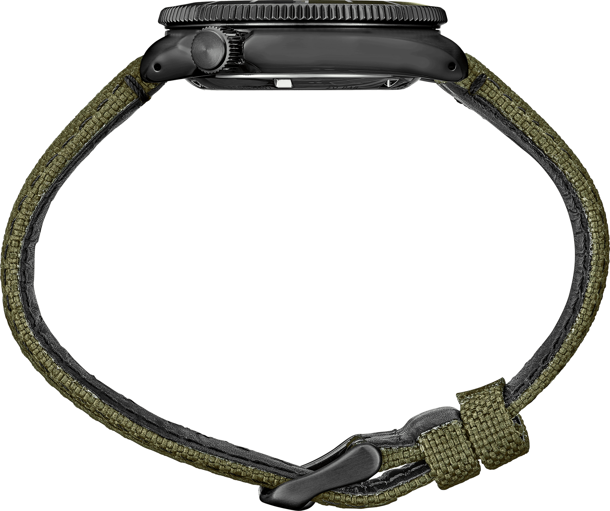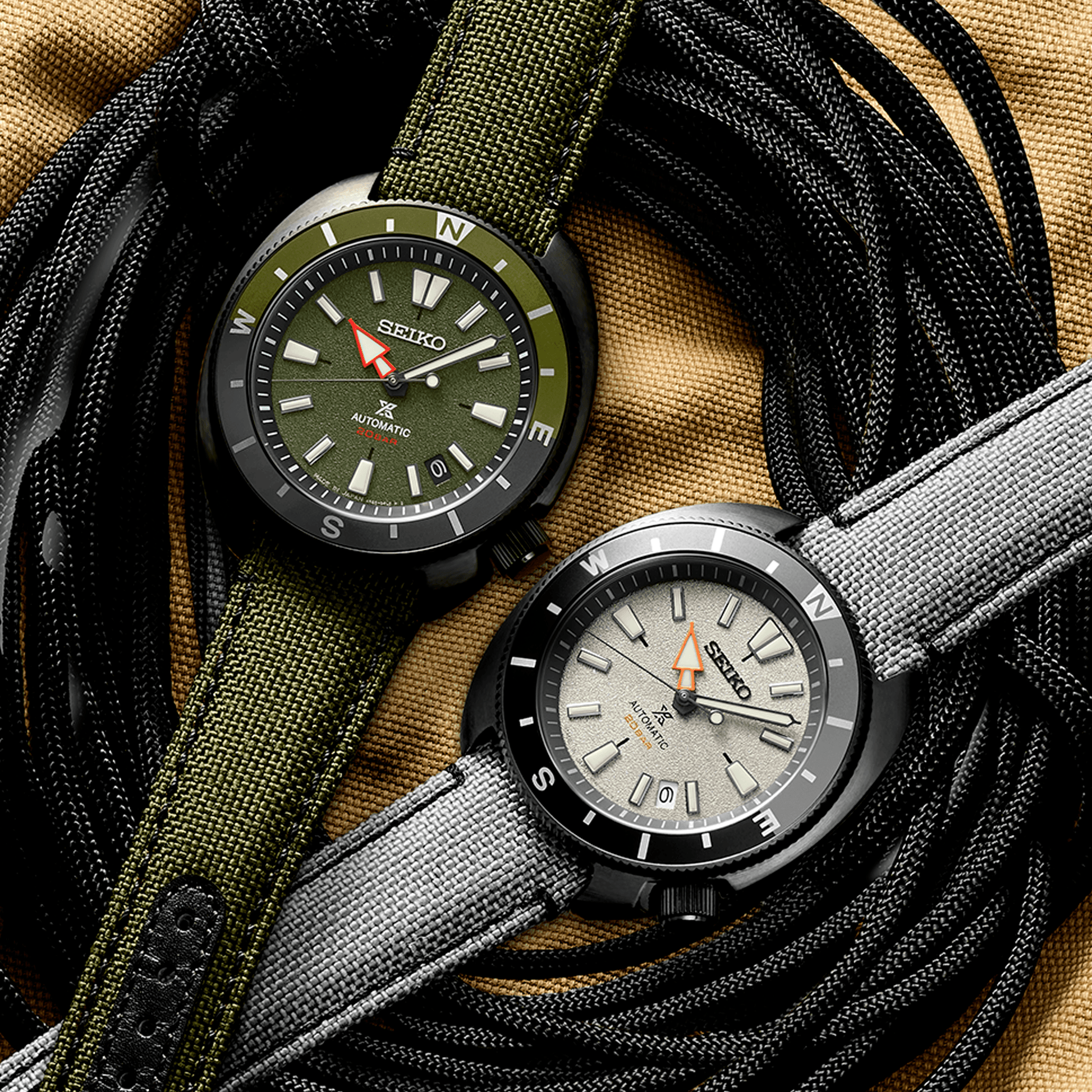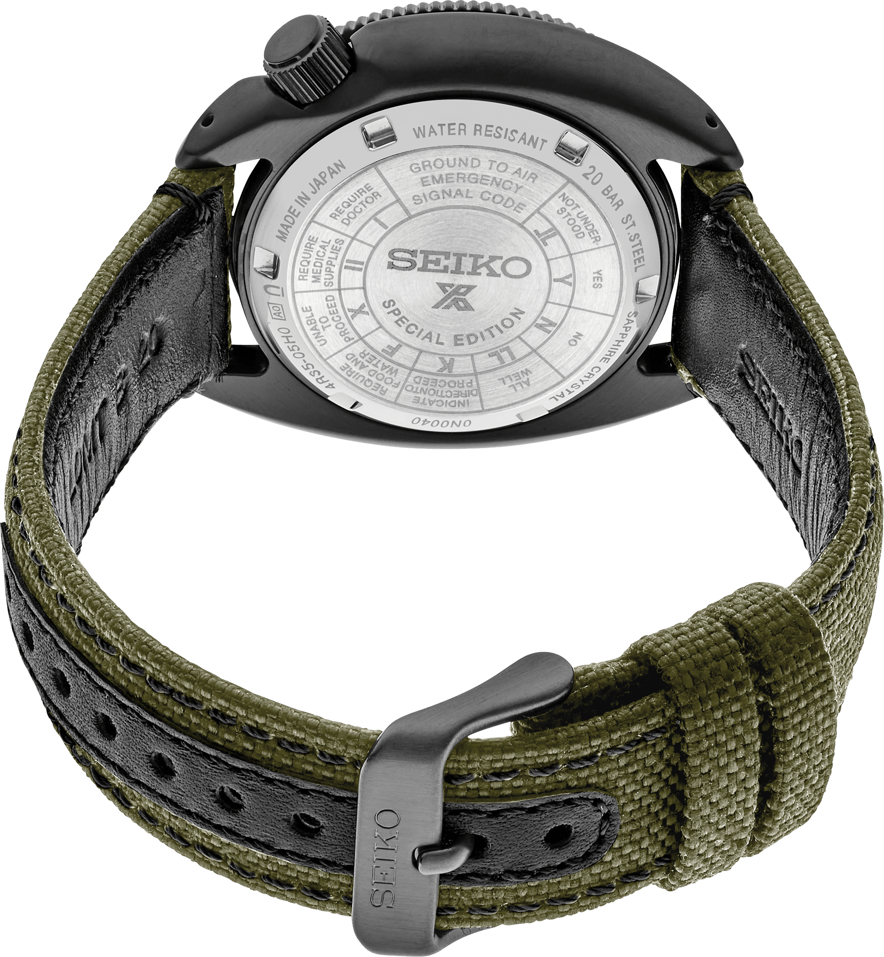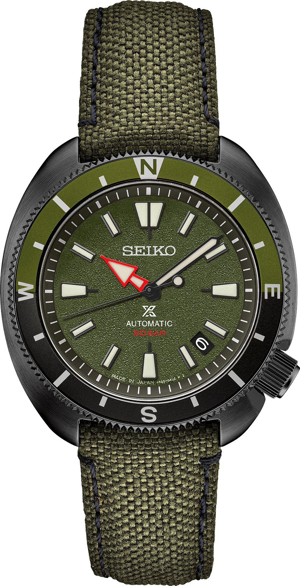 Prospex Land U.S. Special Edition. Designed for those who treat life as the ultimate adventure, Seiko Prospex keeps moving forward, meeting every challenge with technological excellence and winning design. Recalling the styles and earth-tone shades of the 1970s, as well as the colors of camping gear, this expanded collection is designed specifically for outdoor activities such as hiking, including a green and black compass bezel and a listing of emergency codes on each screwdown caseback. Providing reliable timing for every adventure, the 23-jewel automatic movement beats at a frequency of 21,600 vibrations per hour, with a power reserve of approximately 41 hours, and offers manual winding capability. Based on an iconic Seiko design, with sleeker, more compact lines for everyday wear, this versatile watch features a textured green dial with red accents, date calendar, and LumiBrite hands and markers. In stainless steel with black hard coating, secure screwdown crown and scratch-resistant sapphire crystal, this exceptional timepiece includes a green nylon/leather hybrid strap as well as an additional strap in brown leather. 20 bar, 200M Water Resistant