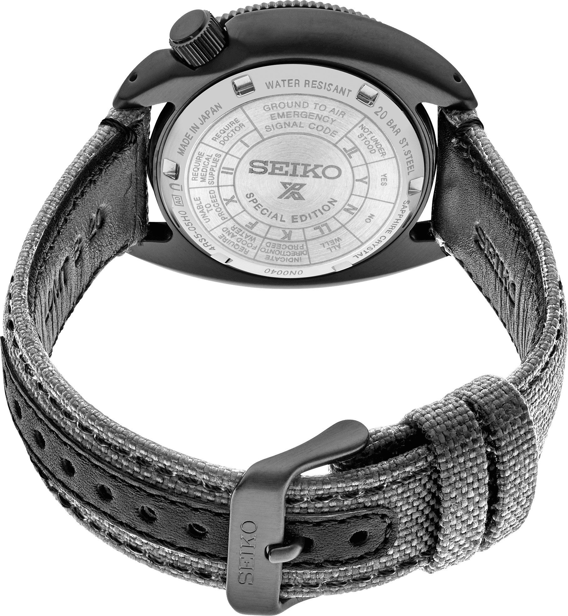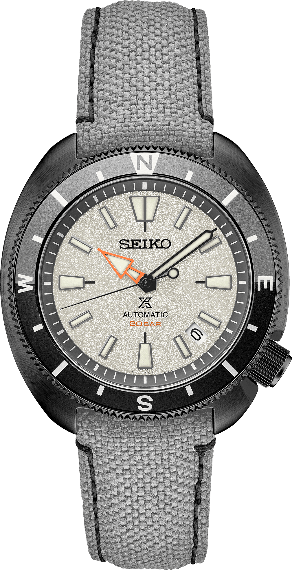 Prospex Land U.S. Special Edition. Designed for those who treat life as the ultimate adventure, Seiko Prospex keeps moving forward, meeting every challenge with technological excellence and winning design. Recalling the styles and earth-tone shades of the 1970s, as well as the colors of camping gear, this expanded collection is designed specifically for outdoor activities such as hiking, including a gray and black compass bezel and a listing of emergency codes on each screwdown caseback. Providing reliable timing for every adventure, the 23-jewel automatic movement beats at a frequency of 21,600 vibrations per hour, with a power reserve of approximately 41 hours, and offers manual winding capability. Based on an iconic Seiko design, with sleeker, more compact lines for everyday wear, this versatile watch features a textured gray dial with orange accents, date calendar, and LumiBrite hands and markers. In stainless steel with black hard coating, secure screwdown crown and scratch-resistant sapphire crystal, this exceptional timepiece includes a gray nylon/leather hybrid strap as well as an additional strap in black leather. 20 bar, 200M Water Resistant