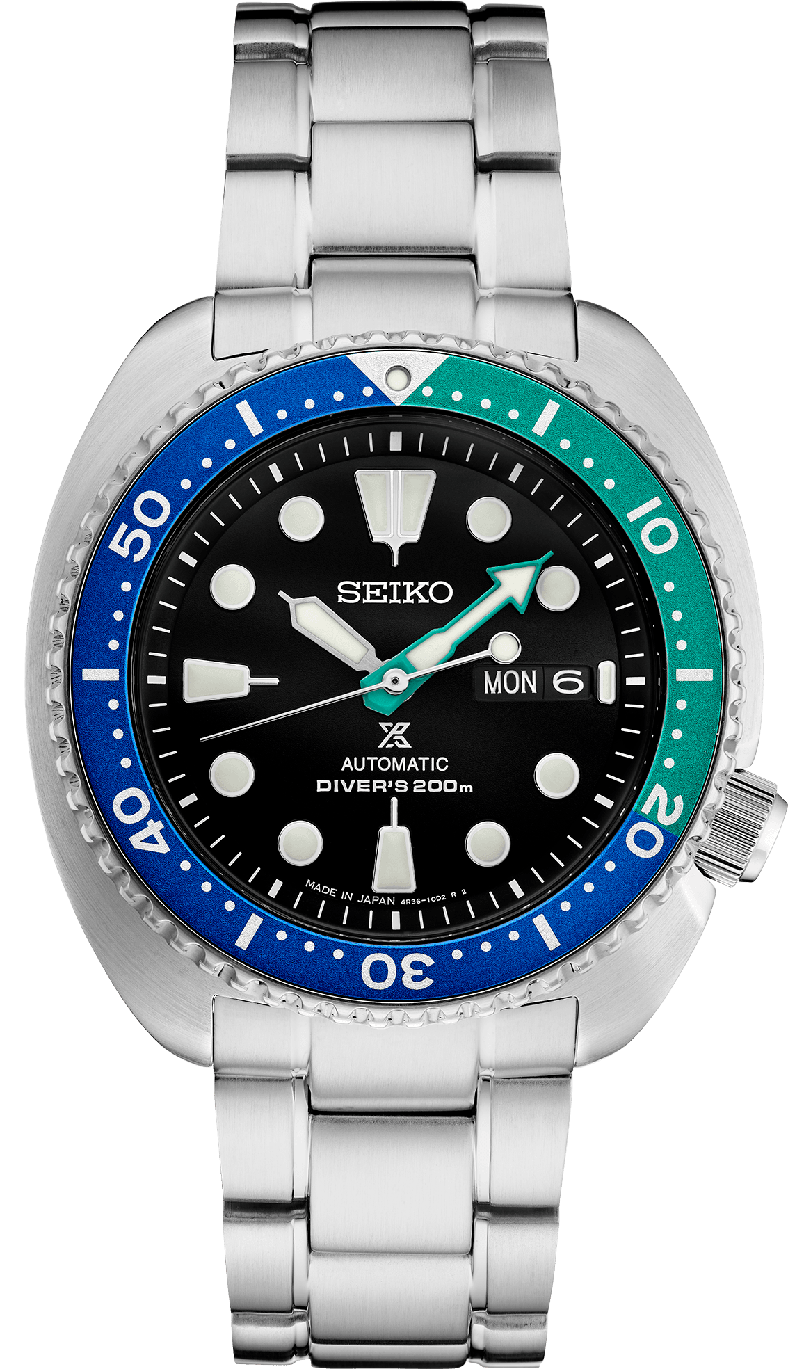 Prospex Special Edition Diver's Watch. Designed for those who treat life as the ultimate adventure, Seiko Prospex keeps moving forward, meeting every challenge with technological excellence and winning design. Inspired by the colors of a tropical lagoon, this vibrant Special Edition features marine blue and green accents on its uni-directional rotating elapsed timing bezel, echoed by the green minute hand and accents on the black dial. The 24-jewel automatic movement beats at a frequency of 21, 600 vibrations per hour, with a power reserve of approximately 41 hours, and offers manual winding capability. Based on an iconic Seiko design, this rugged and stylish watch follows ISO standards for scuba diving at depths of up to 200 meters. Crafted of stainless steel, with screw-down crown and caseback, date calendar, LumiBrite hands and markers, and tri-fold push button release clasp with secure lock and extender. 200m Water Resistant