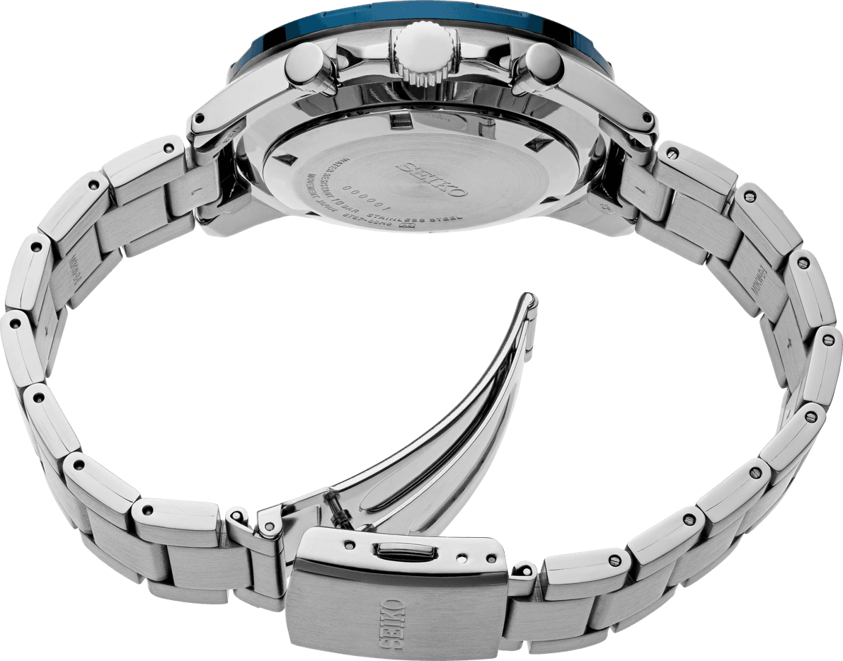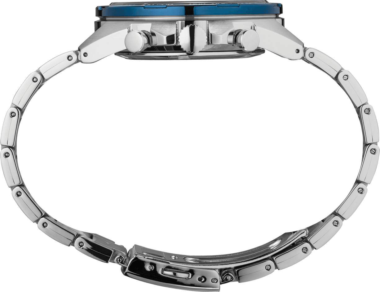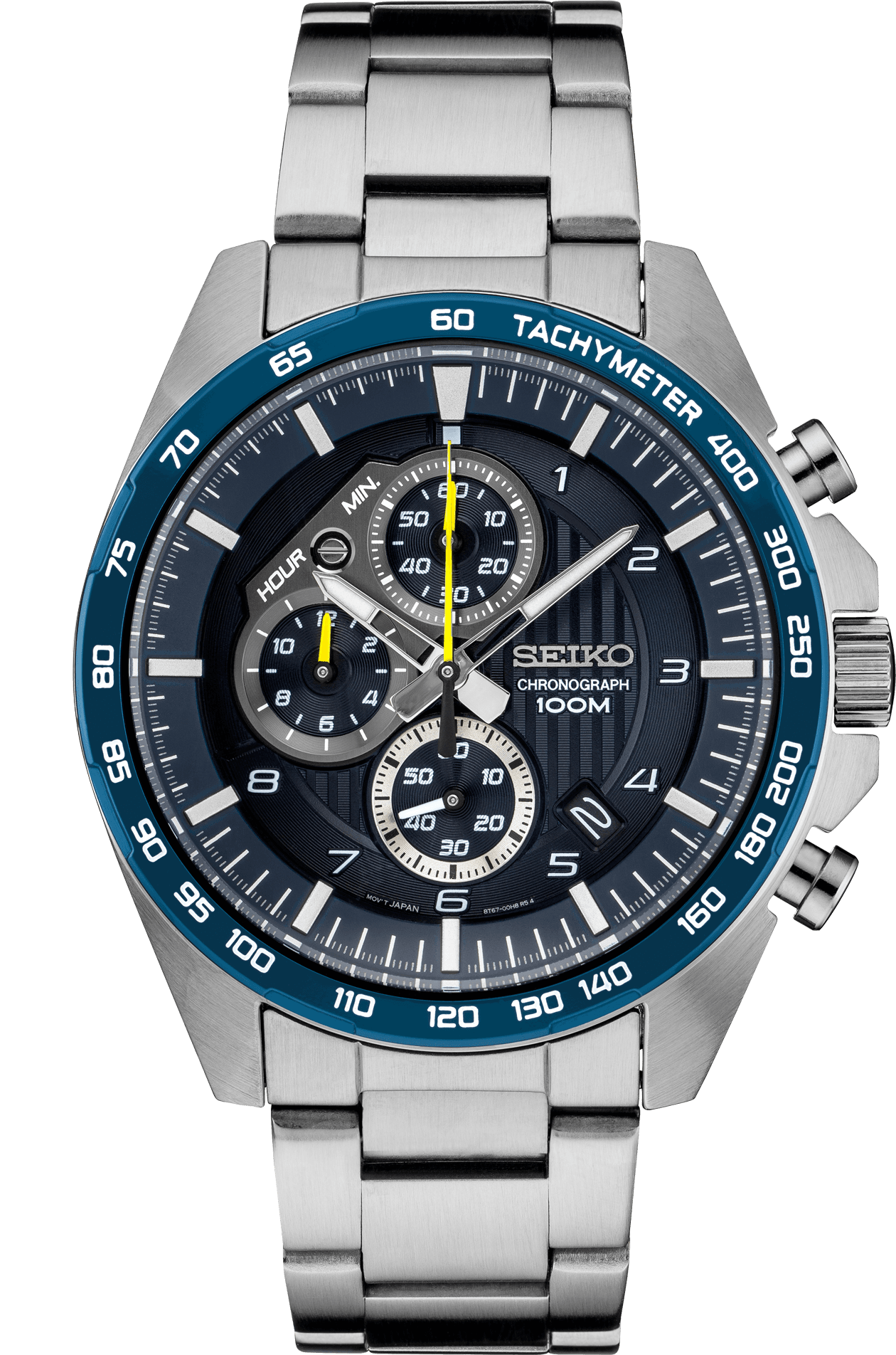From the Men’s Essential Collection. A perfect blend of precision and design, this rugged quartz chronograph is crafted of stainless steel, with secure screwdown caseback and blue ion finish tachymeter bezel. The blue patterned dial, with yellow accents, features three subdials, a date calendar, and LumiBrite hands. Chronograph timing provides measurement of up to 12 hours of elapsed time in 1/5-second increments. 10 bar, 100M Water Resistant