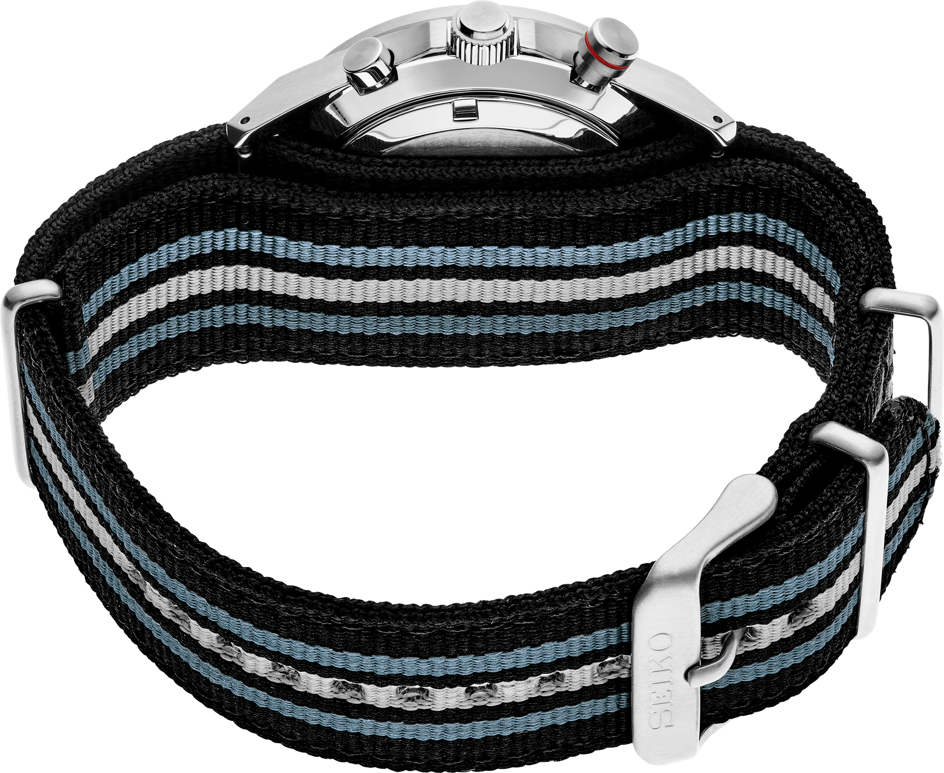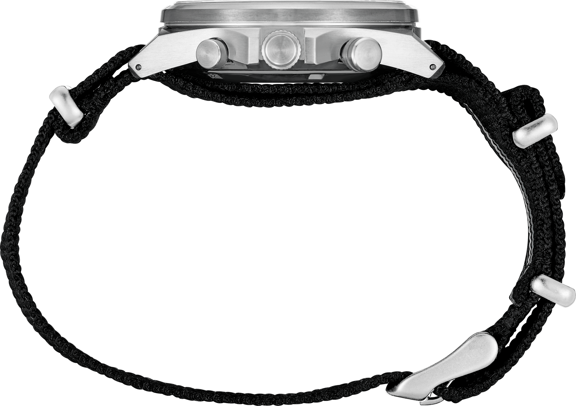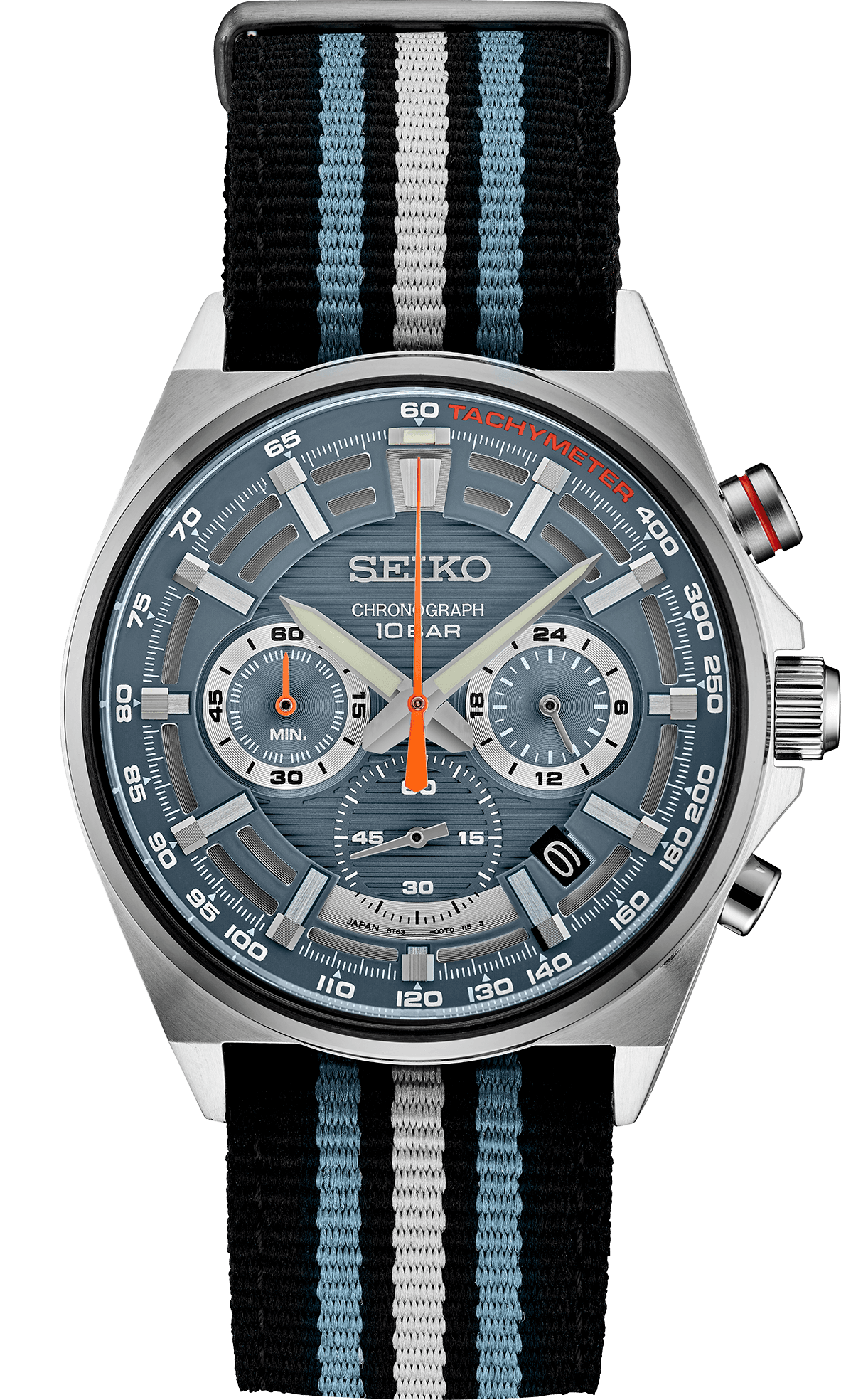 From the Essentials Collection. Inspired by racing, this rugged chronograph combines functionality and fashion for perfect sport or everyday wear. Framed by a light blue tachymeter outer ring, the dimensional embossed light blue dial features applied metallic elements and orange accents. Designed to suggest an engine compartment, the dial also offers three subdials, including a 24-hour indicator and a date calendar, as well as LumiBrite hands and markers. Chronograph timing provides measurement of up to 60 minutes of elapsed time in 1/5-second increments. Crafted of stainless steel with black, blue and silver racing stripe nylon strap. 10 bar, 100M Water Resistant