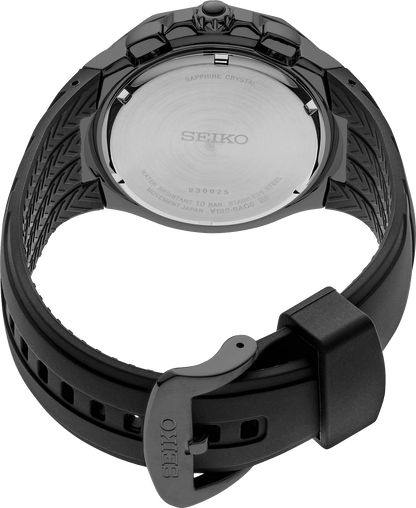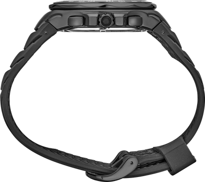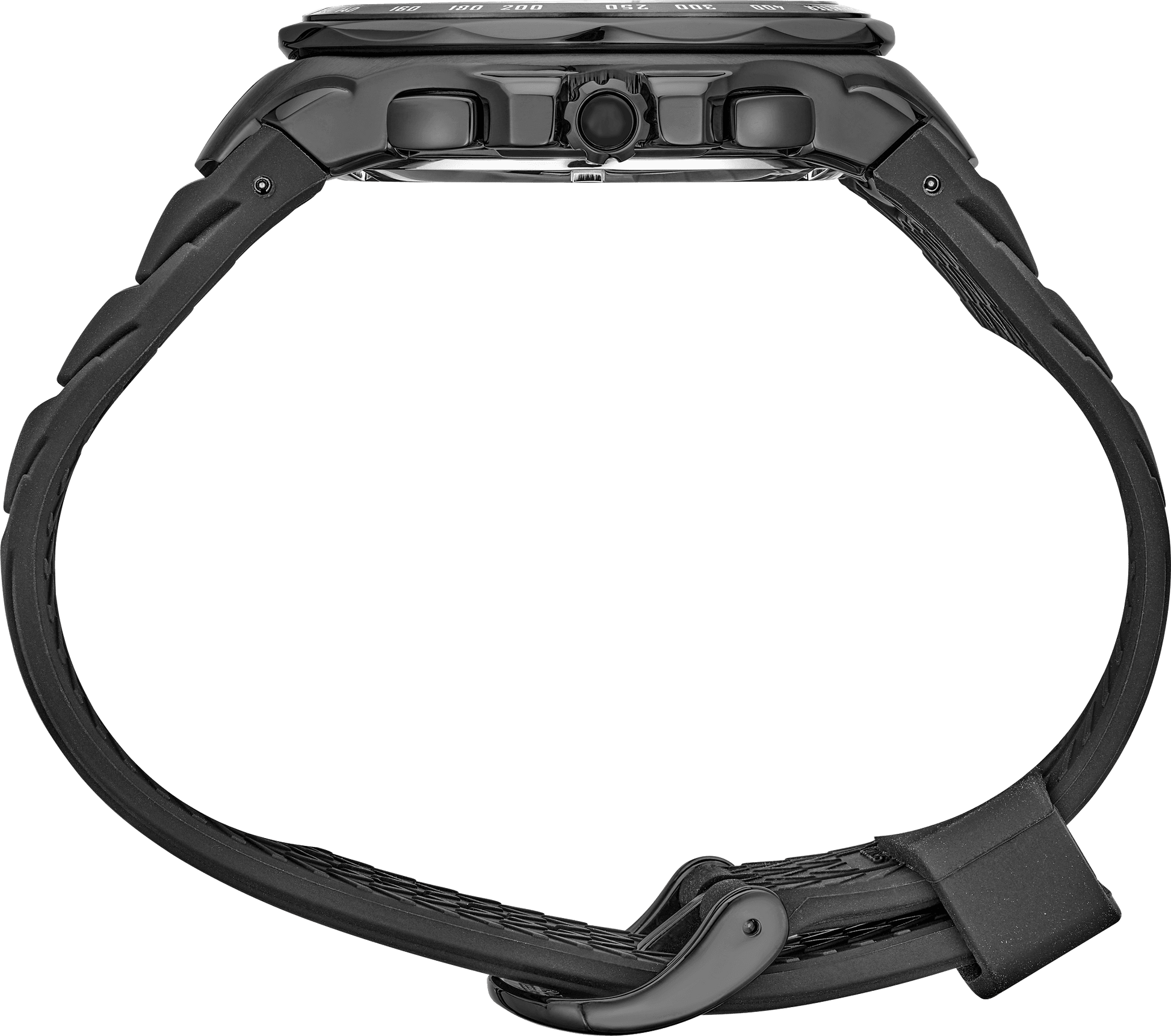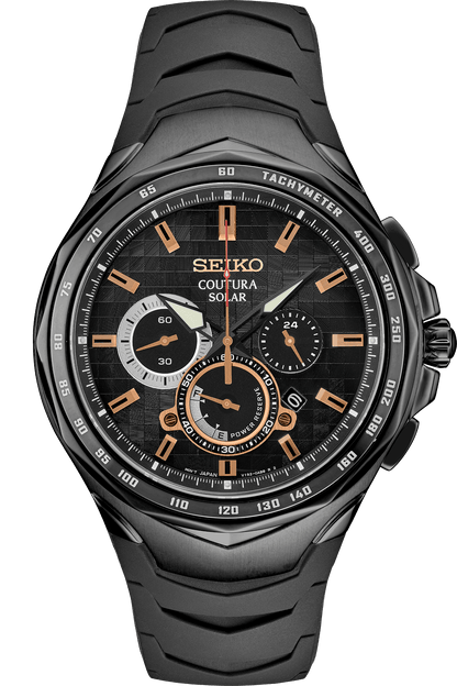 From the Coutura Collection. Delivering the perfect blend of sport and style for those on the move, this boldly distinctive solar chronograph provides effortless timekeeping excellence. Highlighting the dramatic contrast of black and rose gold, this dynamic watch is crafted of stainless steel with black ion finish, screwdown caseback, sapphire crystal, tachymeter bezel, cabochon crown and black silicone strap. In black, with rose gold and silver accents adding a rich dimensionality, the dial features chronograph and 24-hour subdials, a power reserve indicator, date calendar, and LumiBrite hands and markers. The chronograph function offers timing to 60 minutes in 1/5-second increments with split time measurement. Powered by any light source, with no battery change required, the Solar Cell is energy-efficient, with a 6-month power reserve when fully charged. 10 bar, 100M Water Resistant