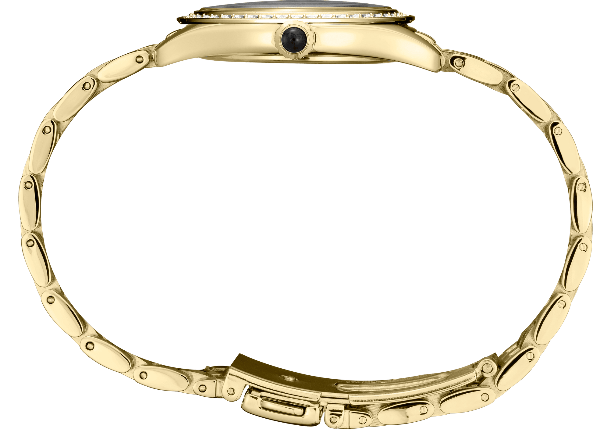From the Crystal Collection. Inspired by jewelry design, this elegant watch is styled to be perfect for both everyday and special occasion use. With dazzling Swarovski® crystals framing a patterned white dial with stylized Arabic numerals, this versatile timepiece is crafted of stainless steel with gold finish and includes a classic cabochon crown. 5 bar, 50M Water Resistant