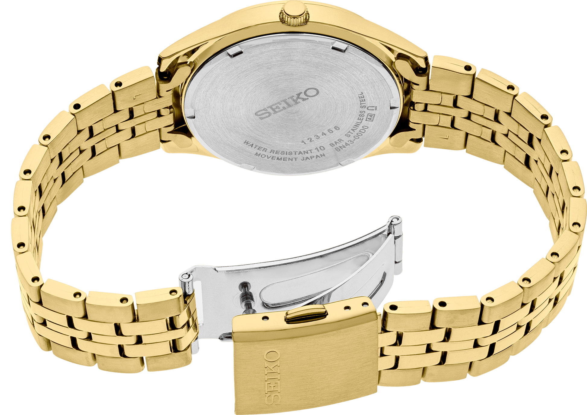 From the Essentials Collection. Offering classic dress/sport designs, the Essentials Collection provides the ideal solution for everyday wear. Crafted of stainless steel in gold-tone finish, this perfectly balanced watch features a champagne sunray dial with day/date calendar and sleek gold stick markers for a superb blend of clarity and style. 10 bar, 100M Water Resistant