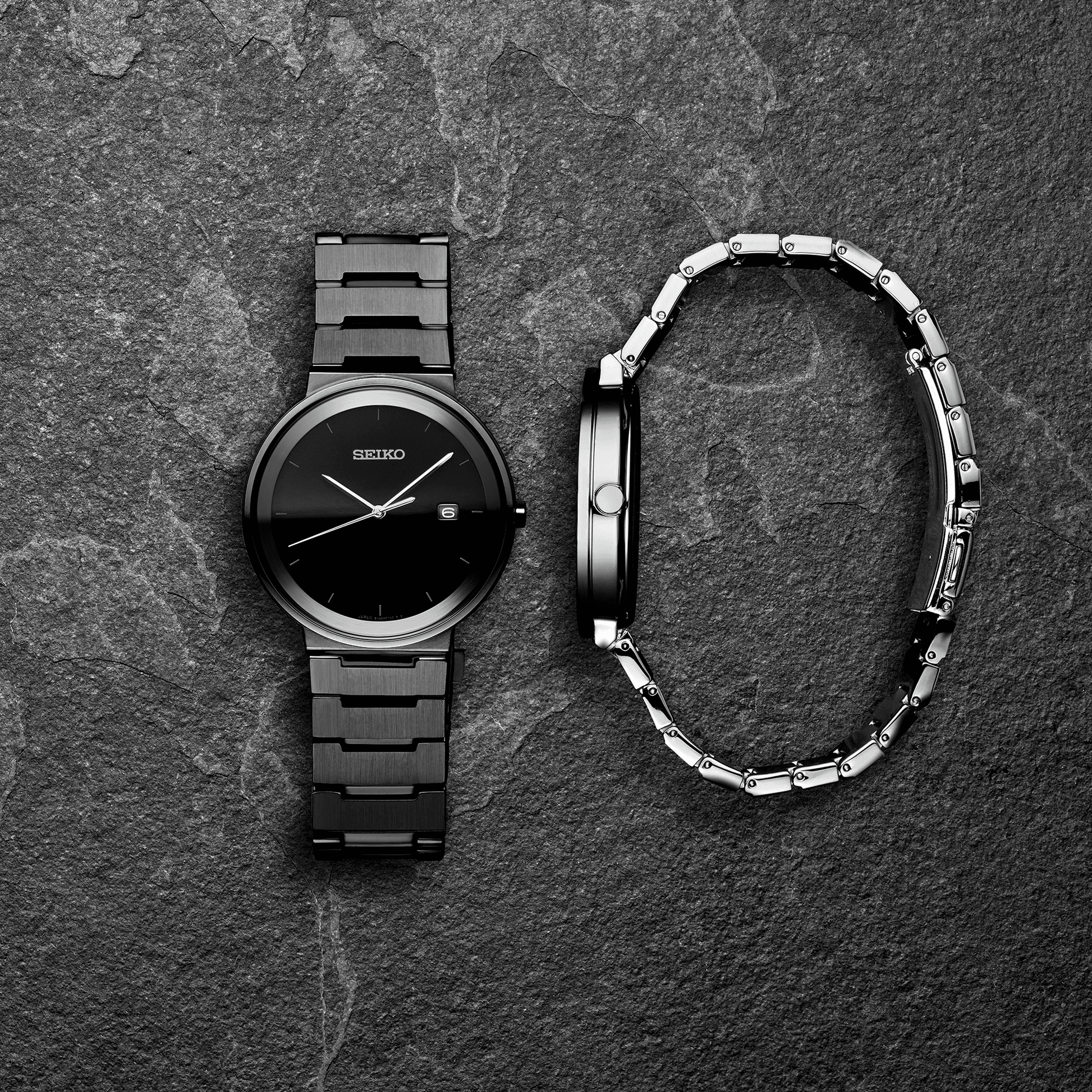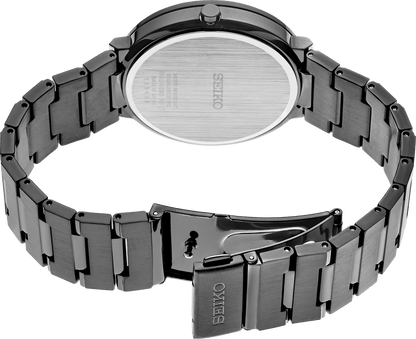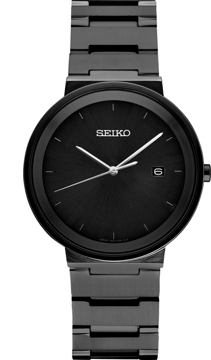 From the Essentials Collection. Offering classic dress/sport design, the Essentials Collection provides the ideal solution for everyday wear. With contemporary minimalism, this sharp and streamlined watch offers a sleek black sunray dial with date calendar, and a slim and comfortable stainless steel case and bracelet in dramatic black ion finish. 3 bar, 30M Water Resistant